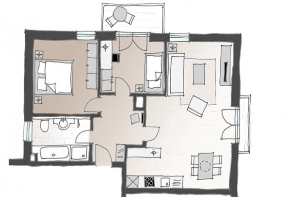 - zwei getrennte Schlafzimmer (Kinder-Zustellbett auf Anfrage)