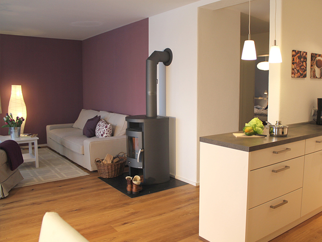 - Wohnzimmer mit Kaminofen und Küchenzeile mit Parkettböden
